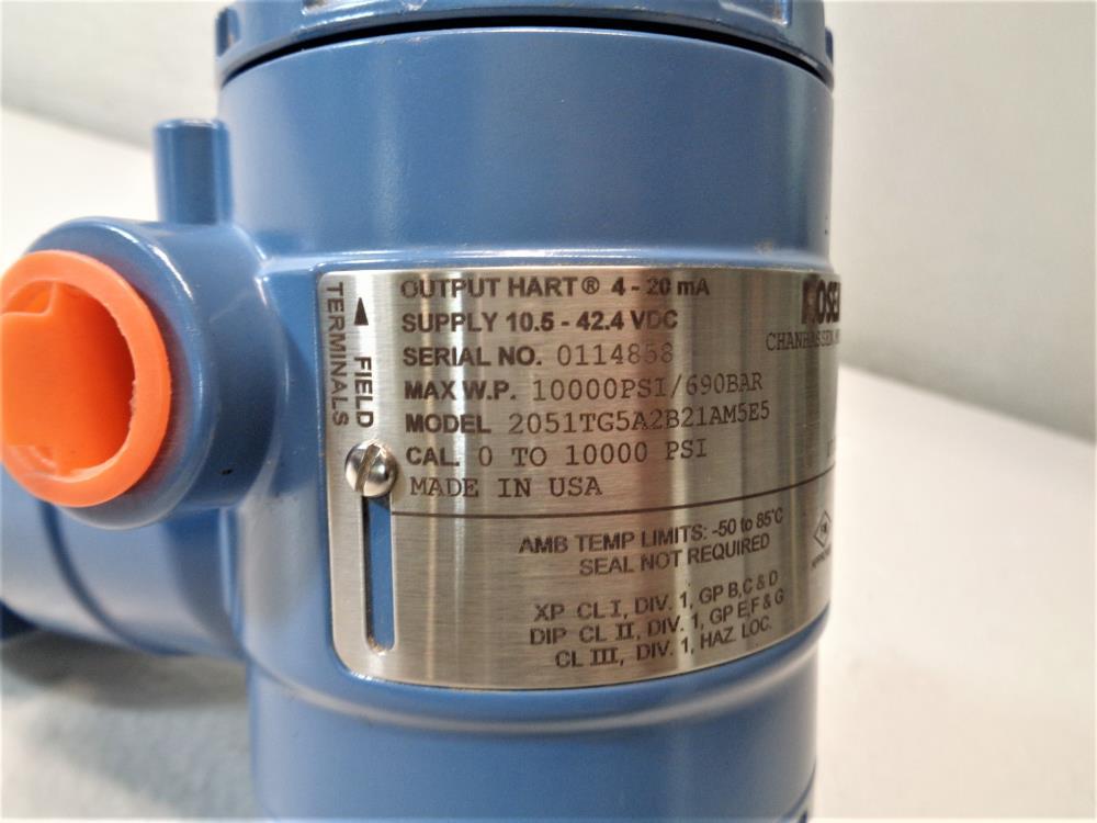 Rosemount 2051 In-Line Pressure Transmitter, 0 - 1000PSI, #2051TG5A2B21AM5E5 Model#: 2051TG5A2B21AM5E5 Output HART 4 - 20 mA Supply 10.5 - 42.4 VDC Max W.P. 10000PSI/69 BAR Cal. 0 to 10000 PSI 1/2" NPT