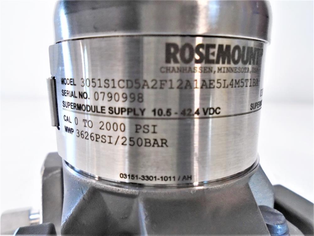 Rosemount 0 to 2000 PSI Pressure Transmitter 3051S1CD5A2F12A1AE5L4M5T1BA Model#: 3051S1CD5A2F12A1AE5L4M5T1BA Cal: 0 to 2000 PSI MWP: 3626 PSI / 250 BAR Supermodule Supply: 10.5 - 42.4 VDC Supermodule Output HART: 4 - 20 mA