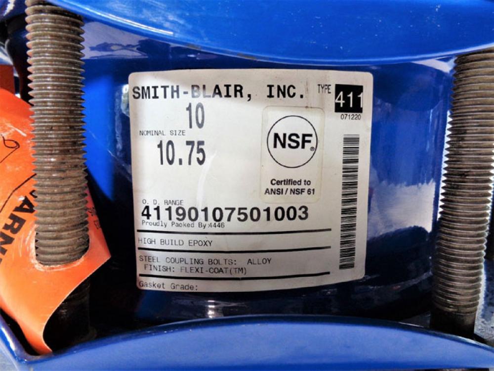Smith Blair 10" Type 411 Steel Coupling 41190107501003 Smith-Blair Inc. Type 411 Steel Coupling Nominal Size: 10" O.D. Range: 10.75" #41190107501003 NSF Certified to: ANSI / NSF 61 High Build Epoxy Steel Coupling Bolts: Alloy Finish: Flexi-Coat