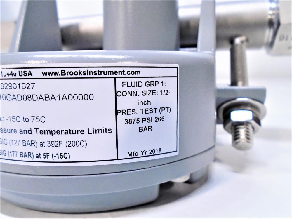 Brooks 1/2" NPT Armored Variable Area Flow Meter, Model 3810GAD08DABA1A00000 Model: 3810GAD08DABA1A00000 Series: 3810 Conn. Size: 1/2" Pres. Test (PT): 3875 PSI/266 BAR Ambient Temperature: -15°C to 75°C Process Pressure and Temperature Limits: 1842 PSIG (127 BAR) @ 392°F (200°C) • 2567 PSIG (177 BAR) @ 5°F (-15°C) Range: R to 1500 SCFH Air @ 100°F & 7.5 PSI (G)
