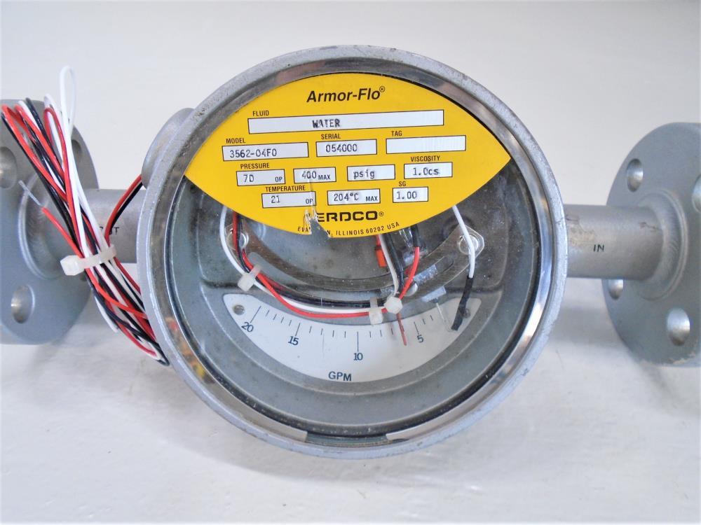ERDCO Armor-Flo 1" 150# Stainless Steel GPM Water Flow Meter 3562-04F0 Model #: 3562-04F0 Fluid: Water Pressure: 70 OP 400 PSIG Max Viscosity: 1.0cs Temperature: 21 OP 204°C Max SG: 1.00 Flange: 1" • 150# • 316 Stainless Steel 25 to 0 GPM Right to Left Flow Direction