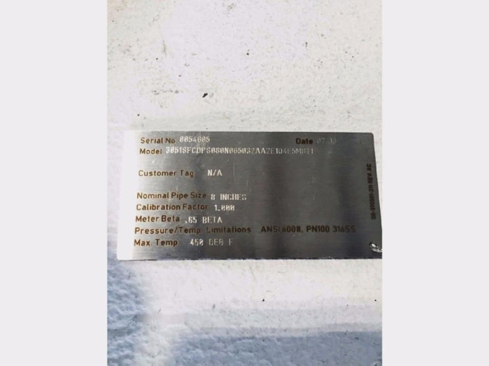 ROSEMOUNT 3051 COMPACT ORIFICE FLOWMETER 3051SFCDPS080N065032AA2E1Q4E5M8T1 ROSEMOUNT 3051 COMPACT ORIFICE FLOWMETER MODEL#: 3051SFCDPS080N065032AA2E1Q4E5M8T1 HOUSING MODEL#: 300S2EAE5M8T1 IP66/68 MWP: 3,626 PSI / 250 BAR SUPPLY: 10.5 - 42.4 VDC OUTPUT: 4 - 20 mA CAL: 0 TO 63.625 IN H2O NOMINAL PIPE SIZE: 8 INCHES CALIBRATION FACTOR: 1.000 METER BETA: 0.65 BETA MAX TEMP: 450° ANSI: 600#, PN100 MAT'L: 316 STAINLESS STEEL