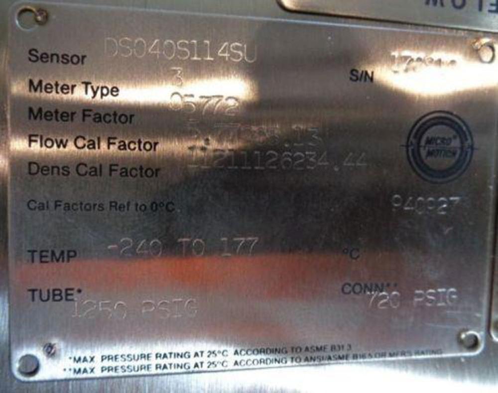 MICRO MOTION MASS FLOW SENSOR DS040S114SU (M) MICRO MOTION MASS FLOW SENSOR MODEL: DS040S114SU TEMP: -240 TO 177 DEG C TUBE: 1250 PSIG CONN: 720 PSIG 1/2" 300# 316L STAINLESS STEEL