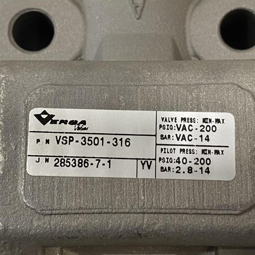 Versa 1/2" NPT 3-Way 316SS Pneumatic Directional Valve VSP-3501-316 Part #: VSP-3501-316 Size: 1/2" FNPT Pressure Range: VAC-200 PSIG Pilot Pressure Range: 40 Min PSIG - 200 Max PSIG