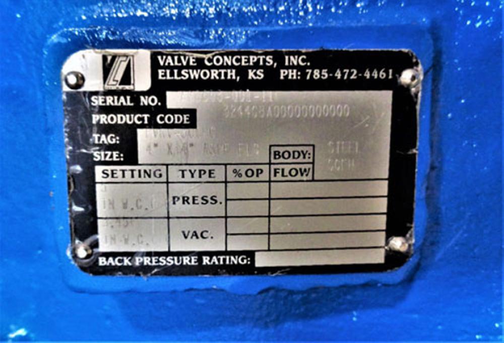 Valve Concepts 4" x 4" Vacuum Relief Vent Valve 3244CBA00000000000 Valve Concepts Vacuum Relief Valve Product Code#: 3244CBA00000000000 V3328 Size: 4" x 4" ASME FLG 150# Body: Steel (WCB) Flow: SCFH Settings: 5 in. W.C. Press Settings: 3.45 in W.C. Vac