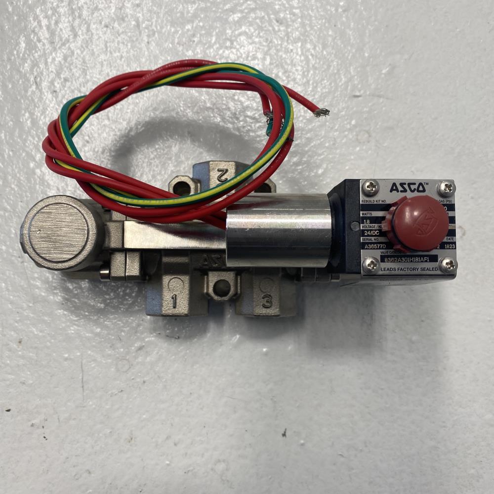 ASCO 1/2” 3-Way 2-Position 316L Solenoid Valve 8362A301H181AF1, EV8004A3 Valve Cat #: 8362A301H181AF1 Solenoid Cat #: EV8004A3 Air/Inert Gas (PSI): 40-150 1.8 Watts Voltage/Hz: 24/DC Pipe: 1/2" NPT Material: 316L Stainless Steel