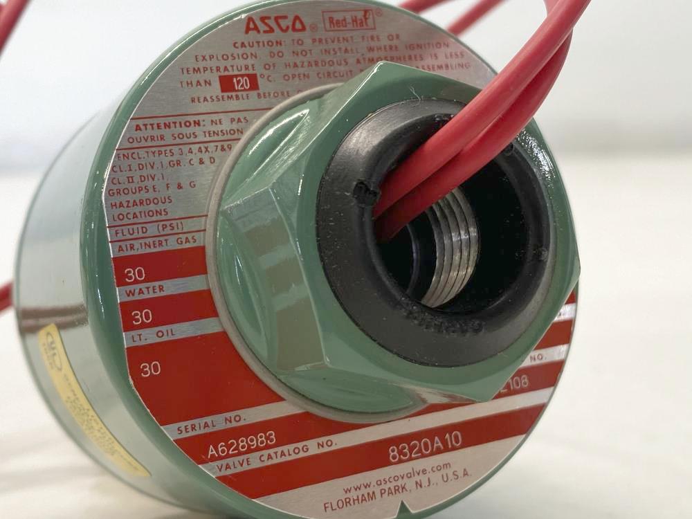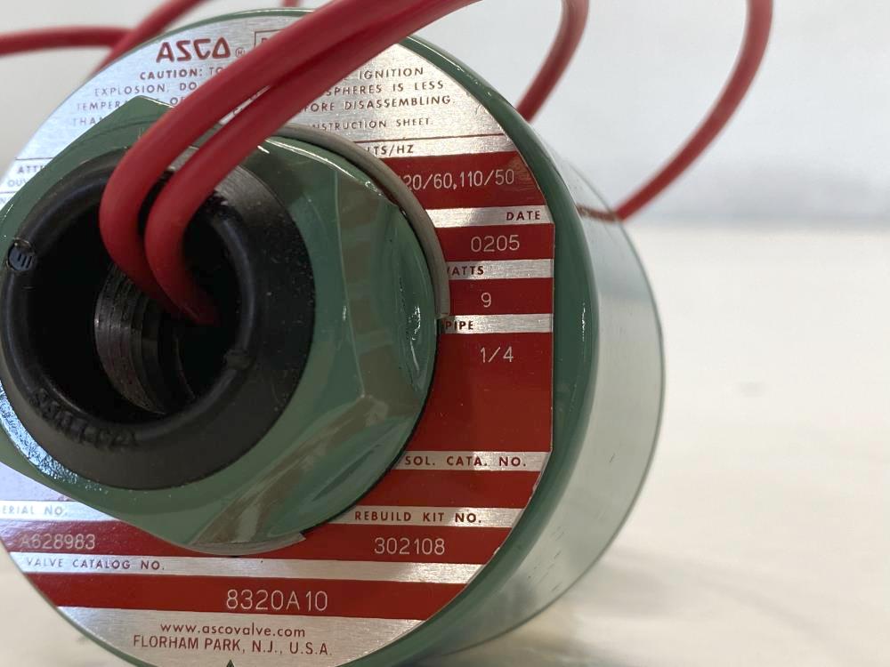 ASCO 1/4" NPT 3-Way Brass Solenoid Valve 8320A10 Valve Catalog #: 8320A10 Pipe: 1/4" NPT 9 Watts Volts/Hz: 120/60 , 110/50 Air, Inert Gas, Water, Lt. Oil 30 PSI