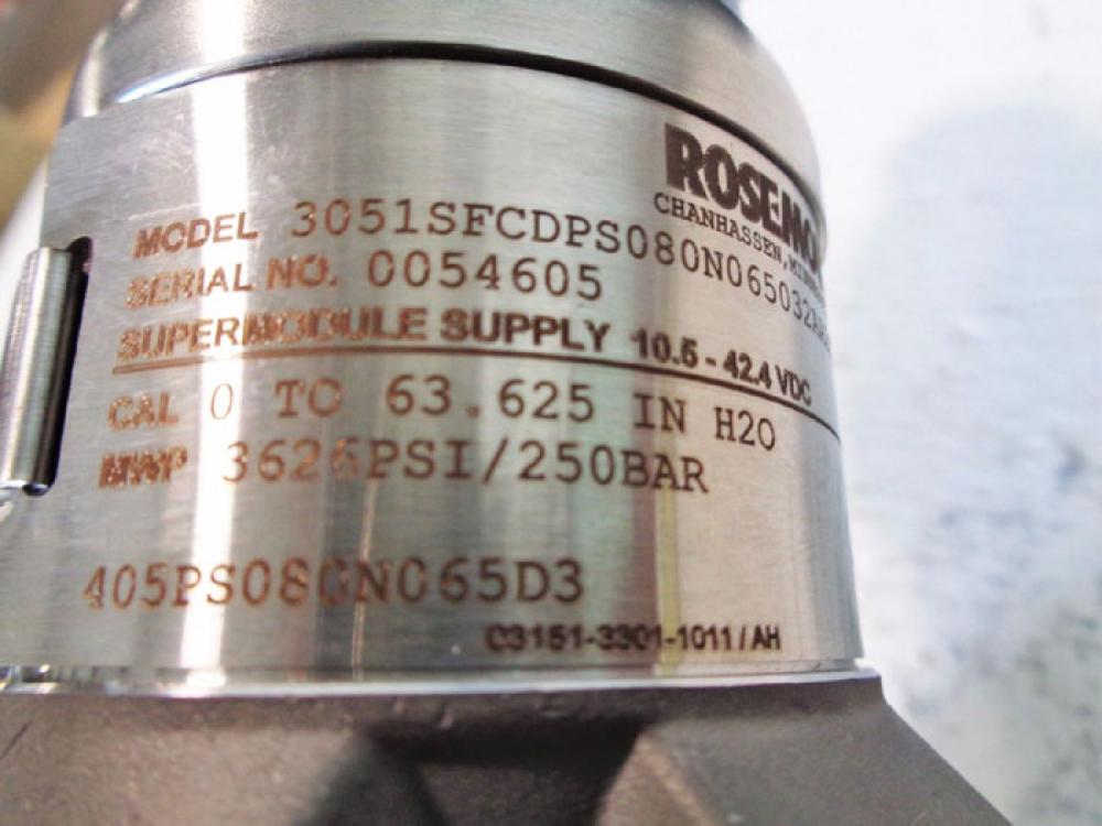 ROSEMOUNT 3051 COMPACT ORIFICE FLOWMETER 3051SFCDPS080N065032AA2E1Q4E5M8T1 ROSEMOUNT 3051 COMPACT ORIFICE FLOWMETER MODEL#: 3051SFCDPS080N065032AA2E1Q4E5M8T1 HOUSING MODEL#: 300S2EAE5M8T1 IP66/68 MWP: 3,626 PSI / 250 BAR SUPPLY: 10.5 - 42.4 VDC OUTPUT: 4 - 20 mA CAL: 0 TO 63.625 IN H2O NOMINAL PIPE SIZE: 8 INCHES CALIBRATION FACTOR: 1.000 METER BETA: 0.65 BETA MAX TEMP: 450° ANSI: 600#, PN100 MAT'L: 316 STAINLESS STEEL