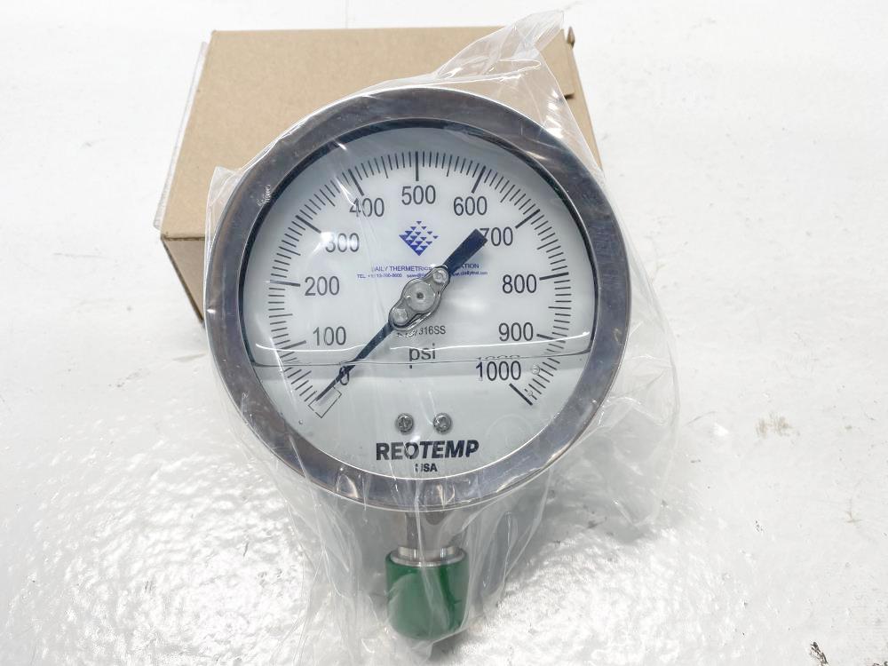 ReoTemp 4" Filled Pressure Gauge 0-1000 PSI Stainless, PR40S1A2P25-DTC-G-T Model #: PR40S1A2P25-DTC-G-T 4" Face Bottom Connection: 1/2" NPT Range: 0-1000 PSI Glycerin-Filled AISI 316 Stainless Steel Tube and Socket 304 Stainless Steel Case