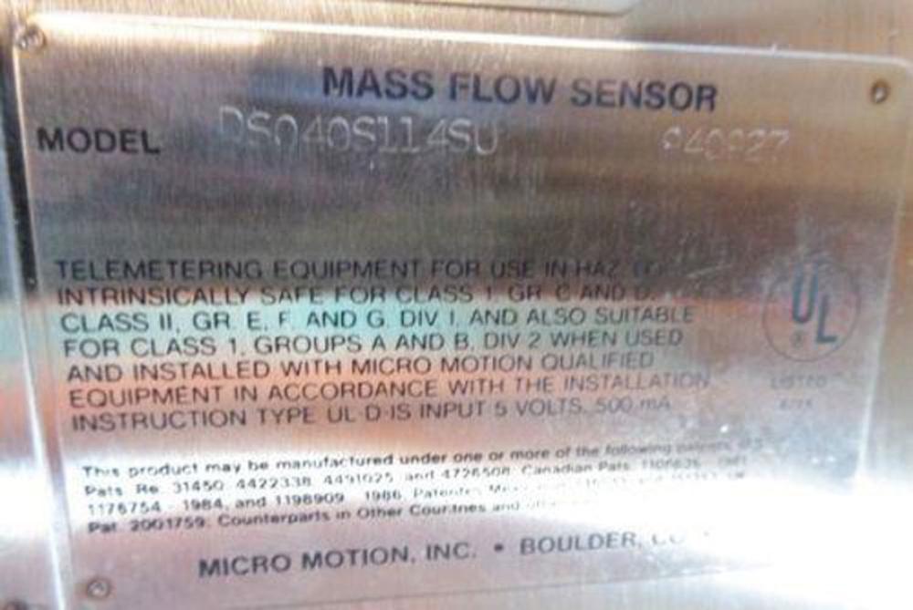 MICRO MOTION MASS FLOW SENSOR DS040S114SU (M) MICRO MOTION MASS FLOW SENSOR MODEL: DS040S114SU TEMP: -240 TO 177 DEG C TUBE: 1250 PSIG CONN: 720 PSIG 1/2" 300# 316L STAINLESS STEEL