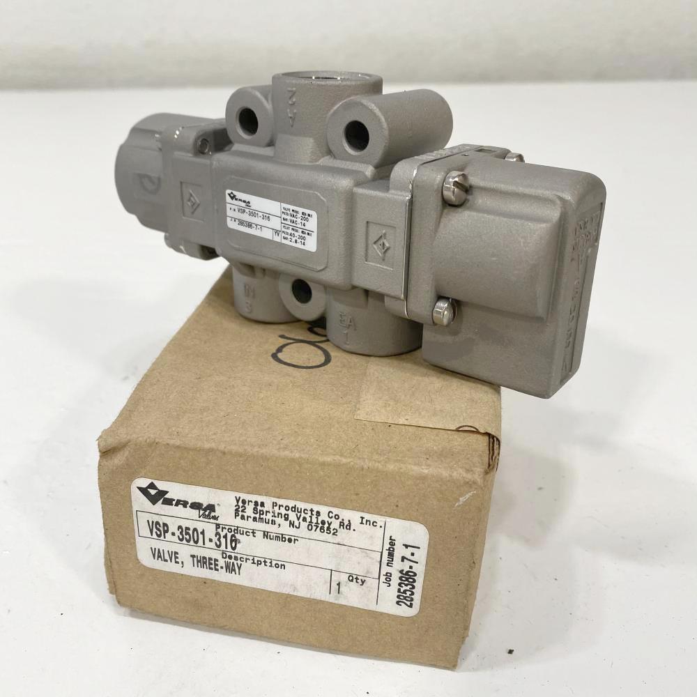 Versa 1/2" NPT 3-Way 316SS Pneumatic Directional Valve VSP-3501-316 Part #: VSP-3501-316 Size: 1/2" FNPT Pressure Range: VAC-200 PSIG Pilot Pressure Range: 40 Min PSIG - 200 Max PSIG