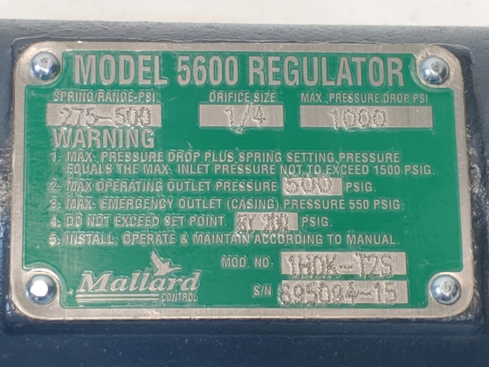Mallard 5600 Regulator, Part#: 5600-1HDK-T2S Part#: 5600-1HDK-T2S Mallard 5600 Regulator Soze Port: 1" NPT Orifice Size: 1/4" Spring Rating: 275-500 PSI Max Pressure Drop: 1000 PSI