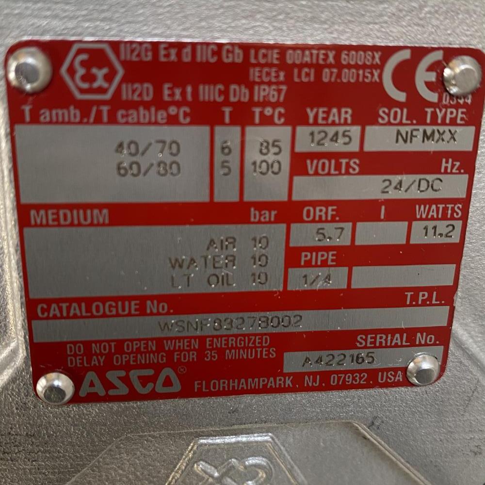 ASCO 1/4" NPT Stainless Steel Explosion Proof Solenoid Valve WSNF8327B002, NFMXX Catalogue #: WSNF8327B002 Pipe Size: 1/4" Body: Stainless Steel Orifice: 5.7 Media: Air, Gas, Water, Oil Operating Pressure Differential: 0-10 BAR Solenoid Type: NFMXX 24/DC 11.2 Watts